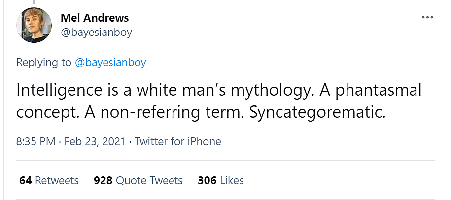 The person then claimed, “Intelligence is a white man’s mythology. A phantasmal concept. A non-referring term. Syncategorematic.”