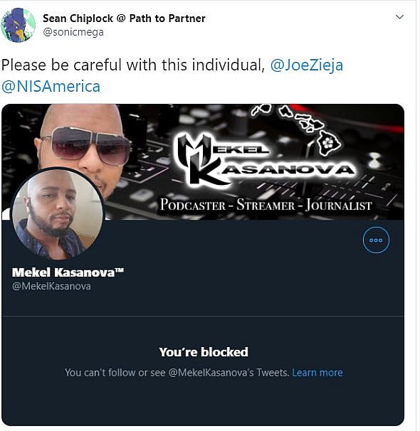 As Zieja and Atlus were also tagged in Kasanova’s tweet, Chiplock produced a screenshot showing himself to be blocked by Kasanova and attempted to warn them to “be careful with this individual.”