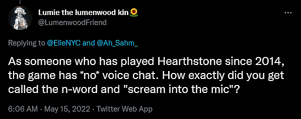 However, as was soon pointed out to Mystal en masse by a number of actual Hearthstone players, this story was unlikely to have occurred as told because the Blizzard-developed card game does not currently allow players to text or voice chat with random opponents – such a function being reserved solely for those who one adds to their friends list – instead only allowing them to communicate via pre-programmed emotes.