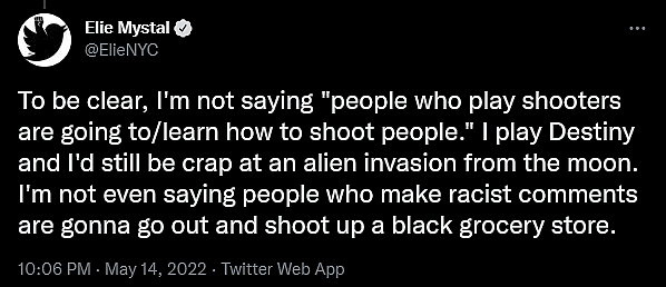 “To be clear, I’m not saying ‘people who play shooters are going to/learn how to shoot people.’ I play Destiny and I’d still be crap at an alien invasion from the moon,” he attempted to clarify. “I’m not even saying people who make racist comments are gonna go out and shoot up a black grocery store.”