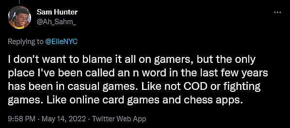 As Mystal’s thread began to disseminate across social media, it soon drew a response from Twitter user @Ah_Sahm_, who offered a caveat to the reporter’s claim and stated, “I don’t want to blame it all on gamers, but the only place I’ve been called an n word in the last few years has been in casual games.”