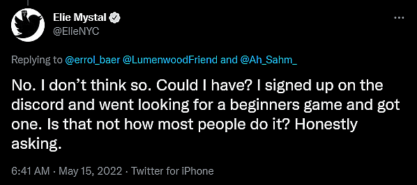 “No,” replied Mystal. “I don’t think so. Could I have? I signed up on the discord and went looking for a beginners game and got one. Is that not how most people do it? Honestly asking.”