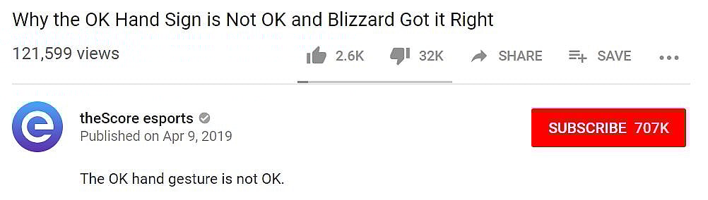 In a short YouTube video, Rosen stated, “Doing the ‘Okay’ hand gesture is not okay. Blizzard was right to ban it and I’ll explain why.” Rosen explains why he believes Blizzard was right, “It might seem innocuous, but it’s been co-opted with ties to white supremacist movements.” Rosen points to the New Zealand shooter using the symbol as to why it’s problematic, “If you are still doubting me, that guy who killed 50 people at two mosques in New Zealand last month flashed the ‘okay’ hand gesture at his arraignment last month.”