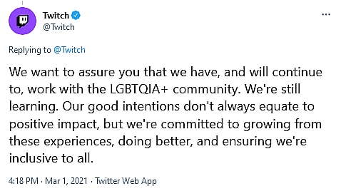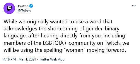 “After hearing directly from you, including members of the LGBTQIA+ community on Twitch, we will be using the spelling ‘women’ moving forward,” said Twitch.