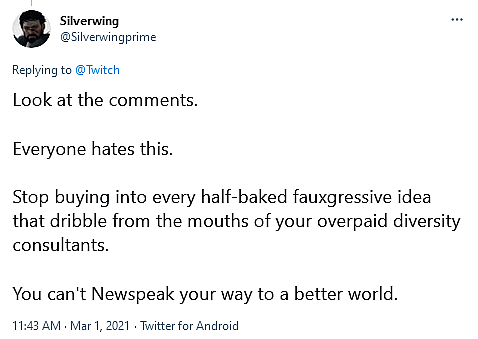 One user, @Silverwingprime, called the live streaming service out for “buying into every half-baked fauxgressive idea that dribble from the mouths of your overpaid diversity consultants.”