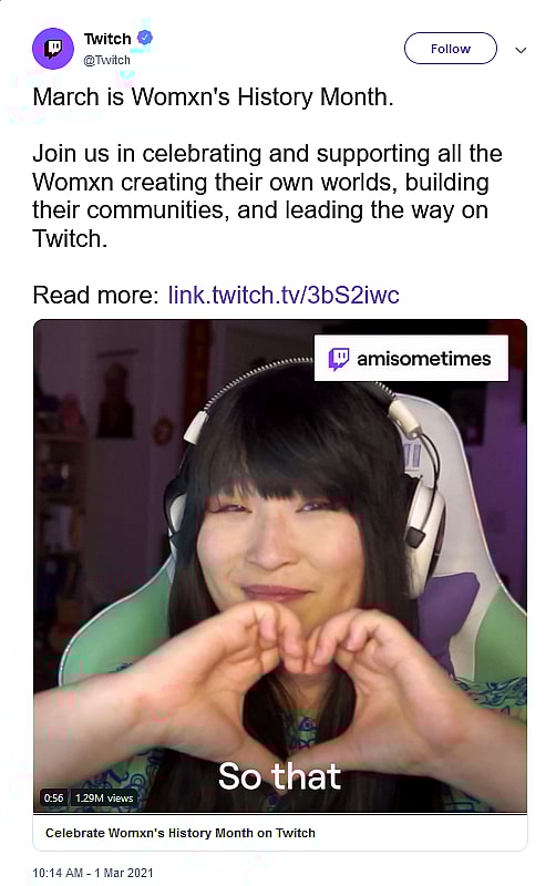Alongside the clip, Twitch wrote a short message, noting that “March is Womxn’s History Month,” and asking users to “join us in celebrating and supporting all the Womxn creating their own worlds, building their communities, and leading the way on Twitch.”