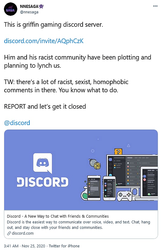 Another member of the Inside Gaming panel, Stephanie “Nnesaga” Ijoma, shared Zombaekillz’ sentiment, asking her own followers to mass-report Griffin Gaming’s Discord server and claiming that “Him and his racist community have been plotting and planning to lynch us.”