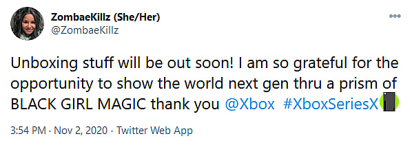 On November 2nd, Zombaekillz announced that she had been given “he opportunity to show the world next gen thru a prism of BLACK GIRL MAGIC” by Microsoft, in the form of a complimentary Xbox Series X.
