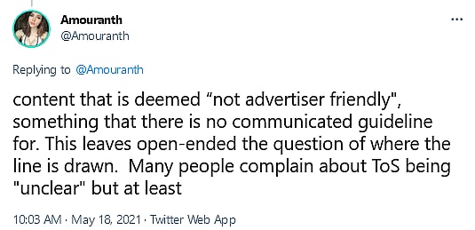 “This leaves open-ended the question of where the line is drawn. Many people complain about ToS being ‘unclear’ but at least there’s something to go by,” she continued.