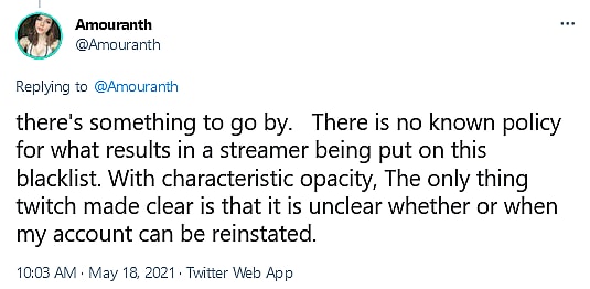 “There is no known policy for what results in a streamer being put on this blacklist.” She concluded, “With characteristic opacity, The only thing twitch made clear is that it is unclear whether or when my account can be reinstated.”