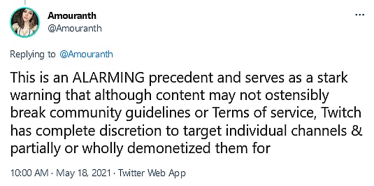 Amouranth then warned, “This is an ALARMING precedent and serves as a stark warning that although content may not ostensibly break community guidelines or Terms of service, Twitch has complete discretion to target individual channels & partially or wholly demonetized them for content that is deemed ‘not advertiser friendly’, something that there is no communicated guideline for.”