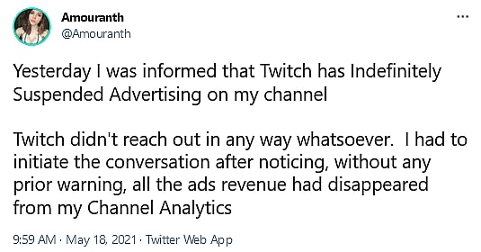 “Twitch didn’t reach out in any way whatsoever,” she added. “I had to initiate the conversation after noticing, without any prior warning, all the ads revenue had disappeared from my Channel Analytics.”