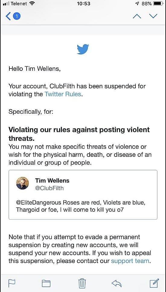Twitter suspended Tim Wellens after he wrote a poem about killing a fictional alien species, the Thargoids, which appear as antagonists in the [easyazon_link identifier=”B0725QSF78″ locale=”US” tag=”boundingintocomics-20″]Elite Dangerous[/easyazon_link] game.