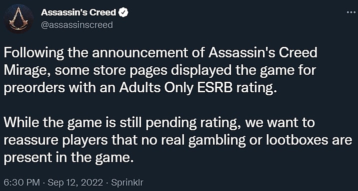 Ubisoft finally broke the silence, issuing a timely statement. “Following the announcement of Assassin’s Creed Mirage, some store pages displayed the game for preorders with an Adults Only ESRB rating. While the game is still pending rating, we want to reassure players that no real gambling or lootboxes are present in the game.”