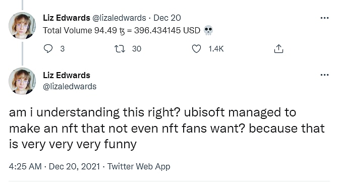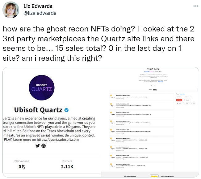 Edwards continued to dig into the Tezos-powered Ubisoft Quartz marketplace and discovered that the sales had made just over $396.43. “Am i understanding this right?” Edwards begged in disbelief. “Ubisoft managed to make an nft that not even nft fans want? because that is very very very funny.”