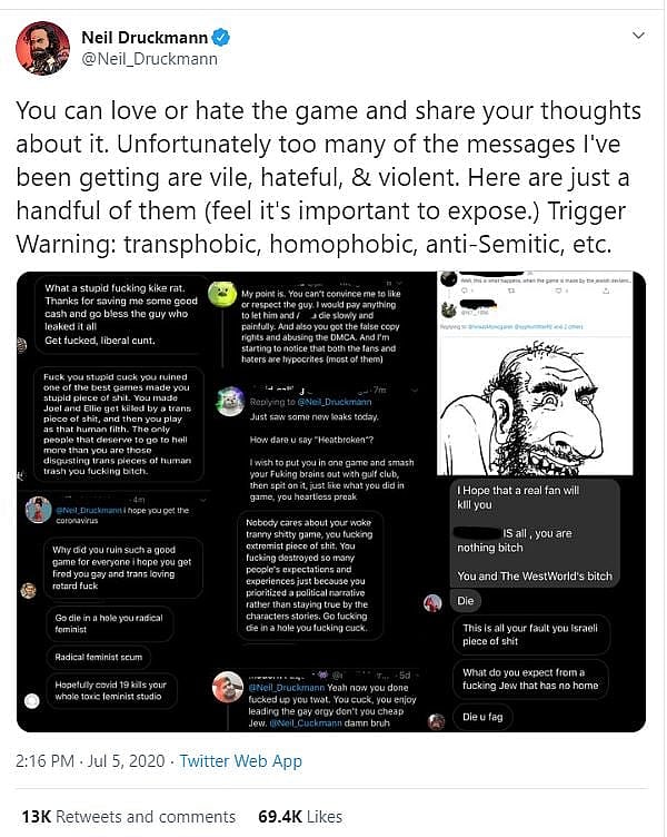 On July 5th, Druckmann would similarly share examples of hateful messages he had received from disgruntled individuals, many of which featured anti-Semitic rhetoric, and observe that “too many of the messages I’ve been getting are vile, hateful, & violent.”