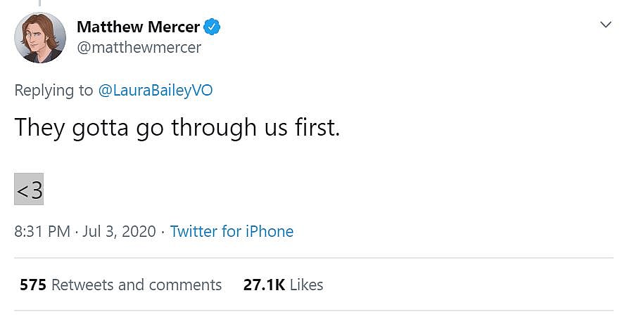 Jojo’s Bizarre Adventure (Jotaro Kujo) and One Piece (Trafalgar Law) voice actor Matthew Mercer wrote, “They gotta go through us first. <3”