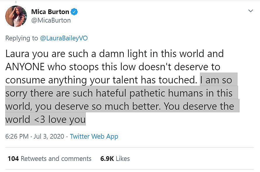 Actress, voice actress, and former Rooster Teeth employee Micah Burton wrote, “Laura you are such a damn light in this world and ANYONE who stoops this low doesn’t deserve to consume anything your talent has touched.”