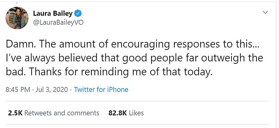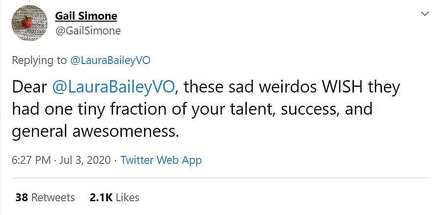 Veteran Marvel and DC writer Gail Simone added, “Dear Laura Bailey, these sad weirdos WISH they had one tiny fraction of your talent, success, and general awesomeness.”