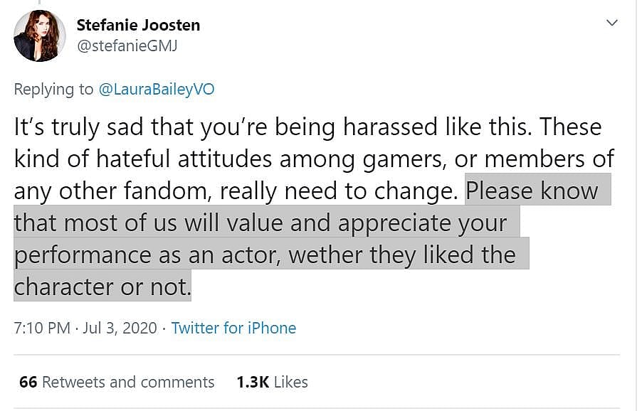 These supporters included Metal Gear Solid V actress Stephanie Joosten, who wrote, “It’s truly sad that you’re being harassed like this. These kind of hateful attitudes among gamers, or members of any other fandom, really need to change.