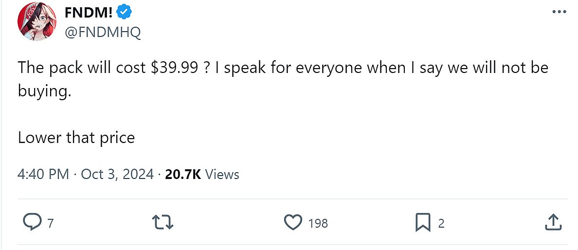 Another player, @FNDMHQ, added to the sentiment by saying, “The pack will cost $39.99 ? I speak for everyone when I say we will not be buying. Lower that price.”
