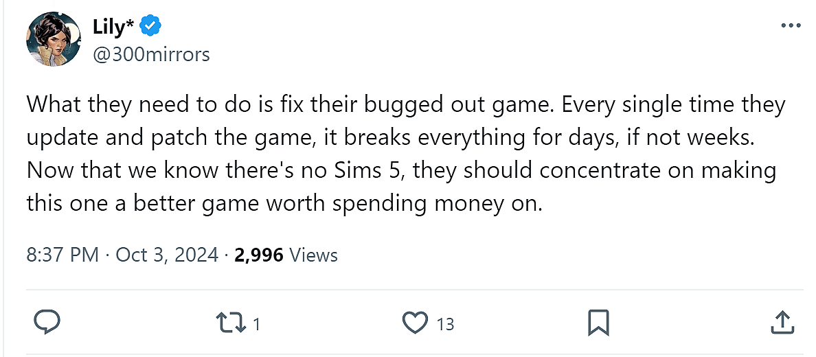 One player, in particular @300mirrors, pointed out that instead of focusing on releasing new content, EA should focus on existing issues in The Sims 4. “What they need to do is fix their bugged out game. Every single time they update and patch the game, it breaks everything for days, if not weeks. Now that we know there’s no Sims 5, they should concentrate on making this one a better game worth spending money on.”