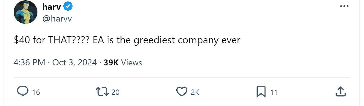 One player and Twitter user, @harrvv stated, “$40 for THAT? EA is the greediest company ever,”.