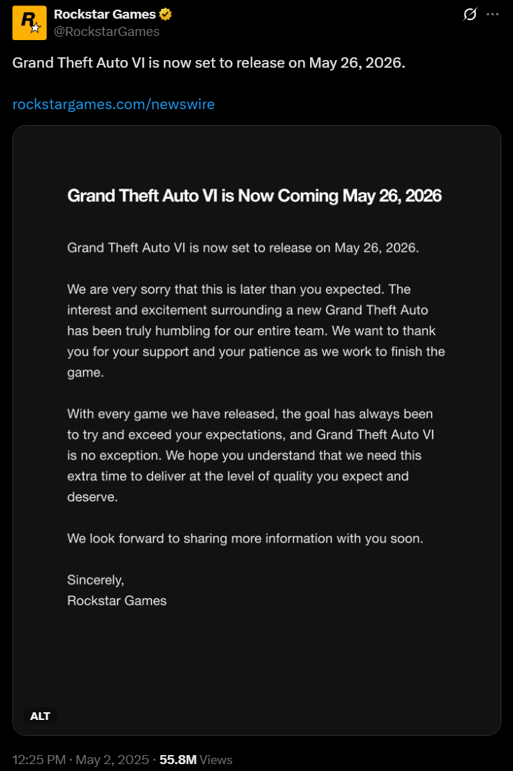 Announced via X on May 2nd, the developer declared “Hi everyone, Grand Theft Auto VI is now set to release on May 26, 2026. We are very sorry that this is later than you expected. The interest and excitement surrounding a new Grand Theft Auto has been truly humbling for our entire team. We want to thank you for your support and your patience as we work to finish the game.”