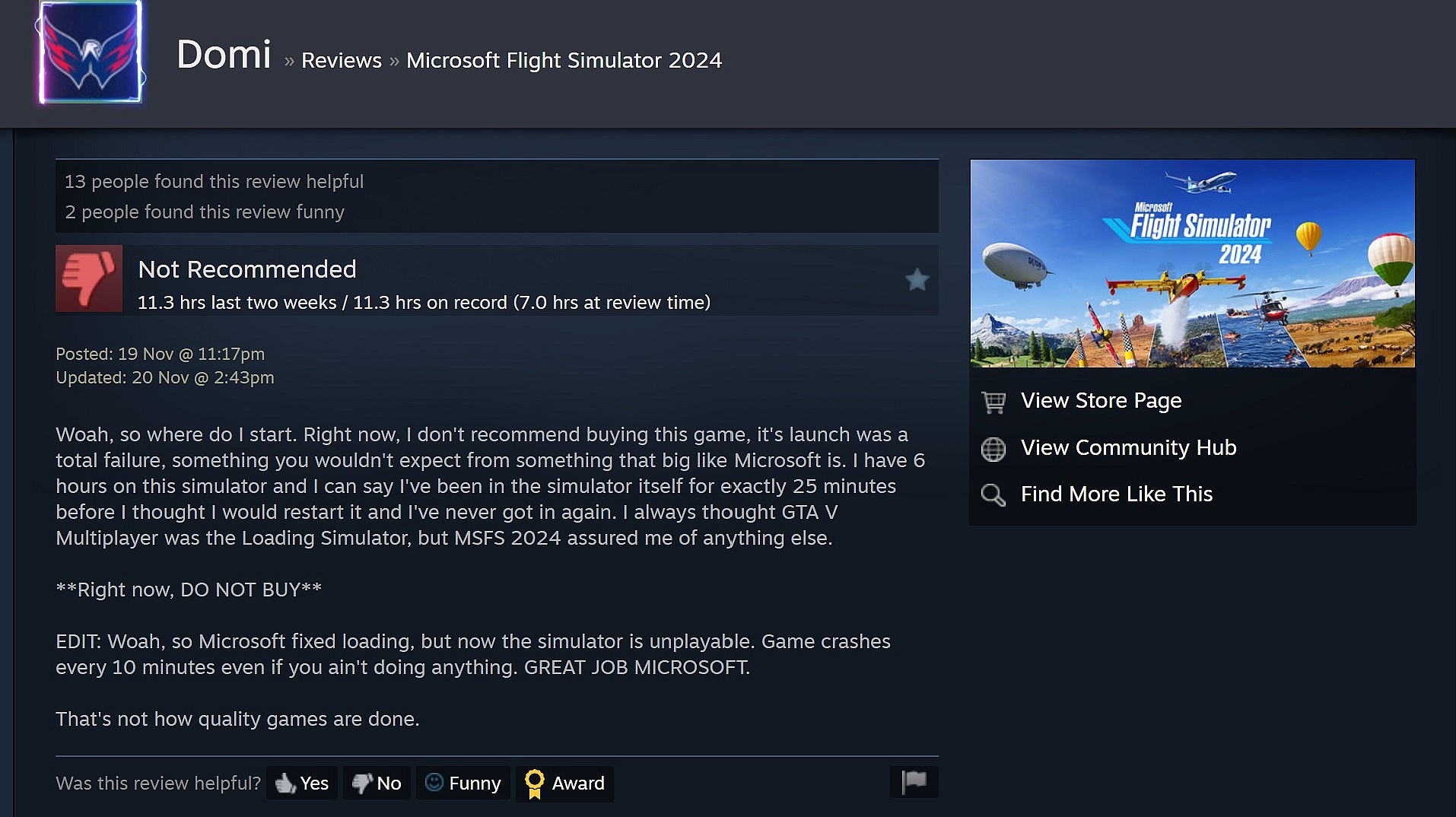 Initially concluding their thoughts with the warning, “Right now, DO NOT BUY,” Domi would later edit their post to add, “Woah, so Microsoft fixed loading, but now the simulator is unplayable. Game crashes every 10 minutes even if you ain’t doing anything. GREAT JOB MICROSOFT.”