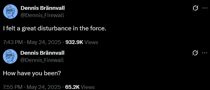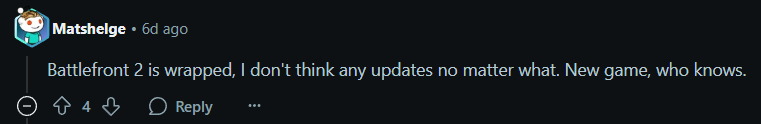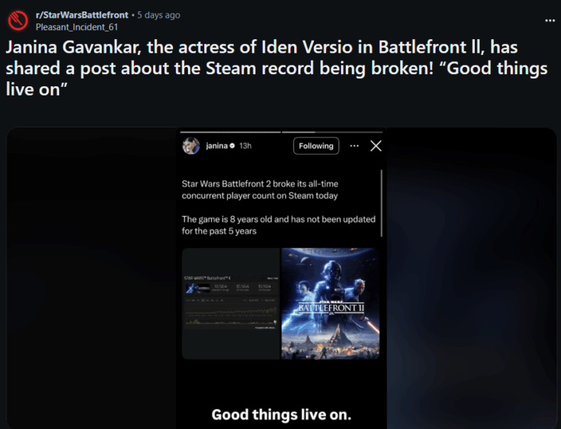 Former developers of Star Wars Battlefront II also took notice. Associate Design Director Dennis Brännvall quipped, “I felt a great disturbance in the force. […] How have you been?” This was Brännvall’s first activity on X since 2023.