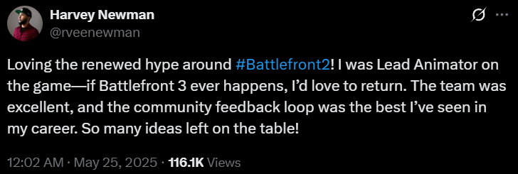 “Loving the renewed hype around #Battlefront2!,” gushed Harvey Newman. “I was Lead Animator on the game- if Battlefront 3 ever happens, I’d love to return. The team was excellent, and the community feedback loop was the best I’ve seen in my career. So many ideas left on the table!”