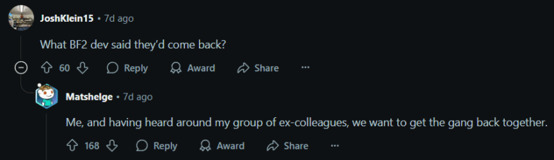 Another Star Wars Battlefront II alumni Mats Helge Holm- QA analyst, associate producer for its Celebration Edition Upgrade- was yet another hoping for a comeback. When a Reddit user asked which developers had confirmed they’d return, Holm (Matshelge) replied “Me, and having heard around my group of ex-colleagues, we want to get the gang back together.”