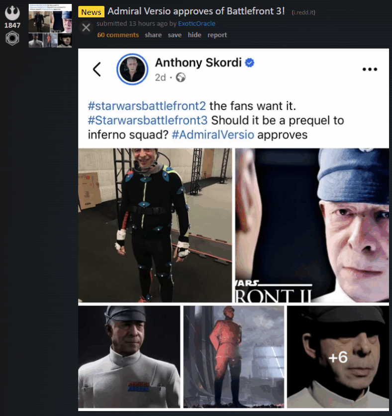 Anthony Skordi meanwhile (Admiral Versio) pitched “#starwarsbattlefront2 fans want it. #Starwarsbattlefront3 Should it be a prequel to inferno squad? #AdmiralVersio approves.” The prequel idea echos Skordi’s earlier comments on X.