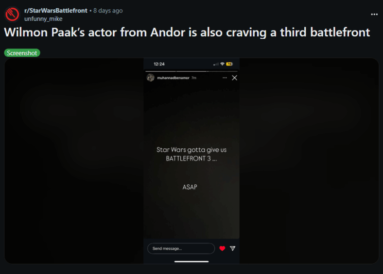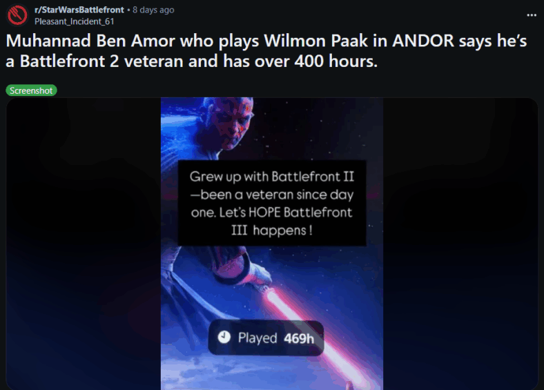 Muhannad Ben Amor, Wilmon in Andor, stated on Instagram (via Reddit) “Star Wars gotta give us BATTLEFRONT 3 … ASAP.” He later added, “Grew up with Battlefront II– been a veteran since day one. Let’s HOPE Battlefront III happens!” along with a screenshot showing he had 469 hours of playtime.