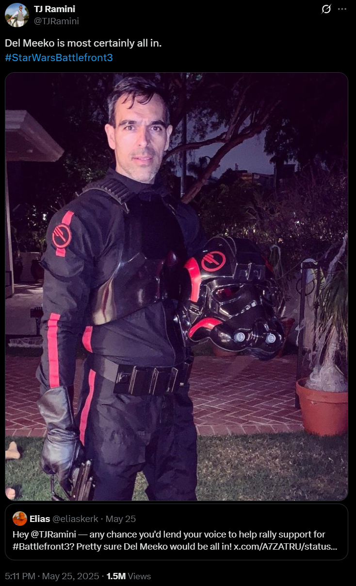 TJ Ramini (Del Meeko) was also asked if he could throw his voice behind the Battlefront III movement. “Del Meeko is most certainly all in. #StarWarsBattlefront3,” Ramini cheered.
