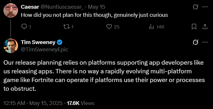 Asked by a fan as to how the company did “not plan for this”, Sweeney clarified, “Our release planning relies on platforms supporting app developers like us releasing apps. There is no way a rapidly evolving multi-platform game like Fortnite can operate if platforms use their power or processes to obstruct.”