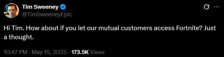 Sweeney took the matter back to Apple’s door-step, or as close as he could get. In reply to a tweet by Apple CEO Tim Cook over accessibility features on Apple devices, Sweeney asked “Hi Tim. How about if you let our mutual customers access Fortnite? Just a thought.”