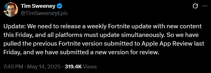 To be fair, the initial delay was far from malicious, as Epic Games CEO Tim Sweeney himself explained, “We need to release a weekly Fortnite update with new content this Friday, and all platforms must update simultaneously. So we have pulled the previous Fortnite version submitted to Apple App Review last Friday, and we have submitted a new version for review.”