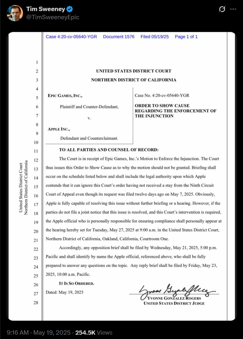 Fast forward to May 16th, and in light of Fortnite still being barred from the App Store, Epic Games filed a Motion to Enforce Injunction with the Oakland, CA District Court asking that they enter an Order “finding that Apple violated the Injunction by refusing to consider Epic’s Fortnite submission; and (2) requiring Apple to accept any compliant version of Fortnite onto the U.S. storefront of the App Store.”