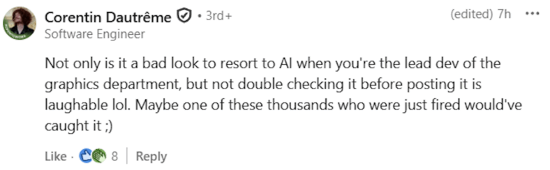 Noting the poor job that had been made designing the advert, another user asserts, “Not only is it a bad look to resort to AI when you’re the lead dev of the graphics department, but not double checking it before posting it is laughable lol.”