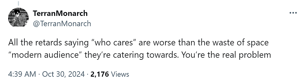 Taking a more fiery approach to sharing his objections, @TerranMonarch declared, “All the retards saying ‘who cares’ are worse than the waste of space ‘modern audience’ they’re catering towards. You’re the real problem”.