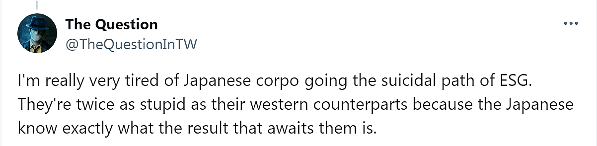 “I’m really very tired of Japanese corpo going the suicidal path of ESG,” wrote X user @TheQuestionInTW. “They’re twice as stupid as their Western counterparts because the Japanese know exactly what the result that awaits them is.”