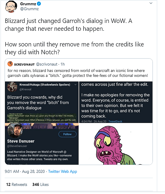 Former Vanilla World of Warcraft team lead Mark kern also took notice of the removal of the word and speculated that this implementation of a “change that never needed to happen” would eventually lead to his removal “from the credits like they did with [Minecraft creator] Notch?”:
