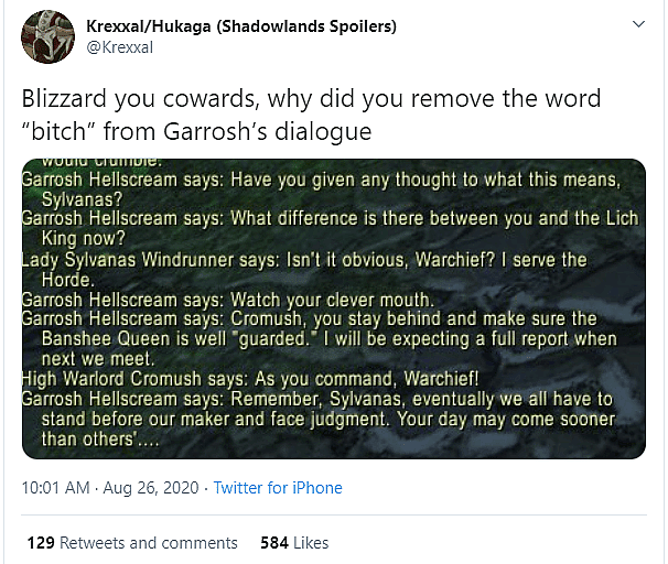 This change did not go unnoticed, as Twitter user @Krexxal caught the change and called out the company, saying, “Blizzard you cowards, why did you remove the word “bitch” from the Garrosh’s dialogue”: