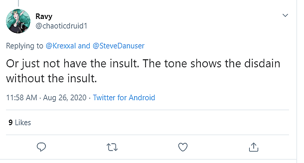 One user, @chaoticdruid1, disagreed with the necessity of the insult and reasoned that “The tone shows the disdain without the insult”: