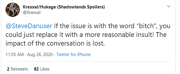 The issue would eventually be escalated to World of Warcraft Lead Narrative Designer Steve Danuser, as @Krexxal argued that “if the issue is with the word “bitch”, you could just replace it with a more reasonable insult!” and tagged Danuser directly: