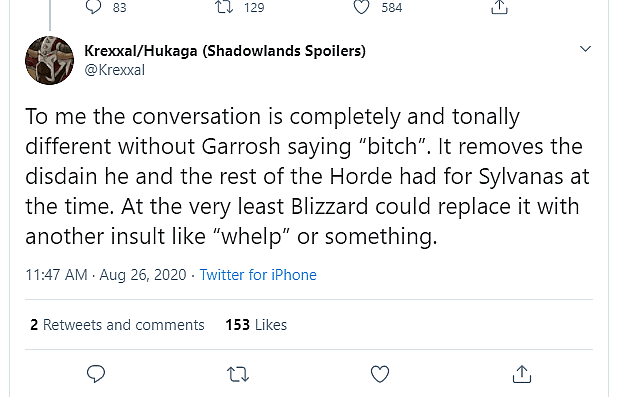 “It removes the disdain he and the rest of the Horde had for Sylvanas at the time,” @Krexxal continued. “At the very least Blizzard could replace it with another insult like ‘whelp’ or something.”