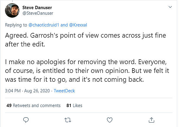 “Agreed. Garrosh’s point of view comes across just fine after the edit. I make no apologies for removing the word. Everyone, of course, is entitled to their own opinion. But we felt it was time for it to go, and it’s not coming back,” noted Danuser:
