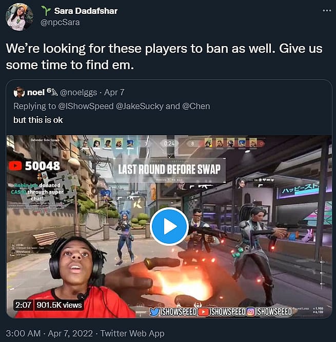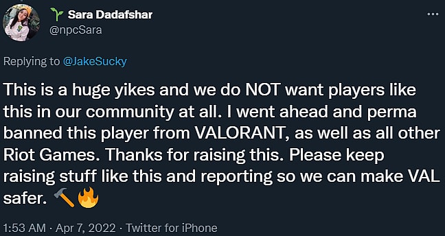 Taking notice of Lucky’s share of the initial clip, Valorant producer Sara Dadafshar tweeted, “This is a huge yikes and we do NOT want players like this in our community at all,” before immediately declaring, “I went ahead and perma banned this player from VALORANT, as well as all other Riot Games.”