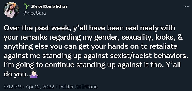 Subsequently alleging that a number of Speed’s fans – of which there are at least 7.14 million accorindng to his YouTube subscriber count took to harassment to bring him back, Dadafshar tweeted in follow up, “Over the past week, y’all have been real nasty with your remarks regarding my gender, sexuality, looks, & anything else you can get your hands on to retaliate against me standing up against sexist/racist behaviors.”